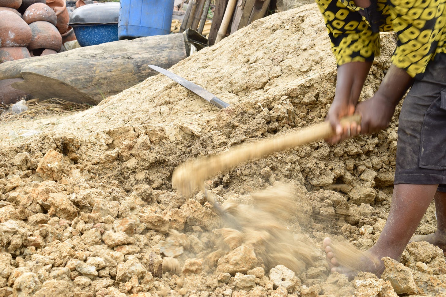 I help throughout the entire process for I really want to feel what it is to get clay. I am so used to the effortless pottery life, either buying the already-processed clay or foraging small amounts. This is serious business and I want to dirty my hands. Something the women appreciate and admire which results in them labelling me their ‘number one’, the only visitor they’ve had so far who has worked this hard. And what can I say? I do deserve the nickname as I even take my shoes off when the clay is wet, just like them, to continue hitting the hoe against the soil. My feet are happy. My arms knackered. Ìyá Lẹ́kàn tells me to stop, to pass her the hoe and so we go on, in turns, getting little moments of rest. I bet she is thankful for this is so tough. These women’s strength… I bow to them.
